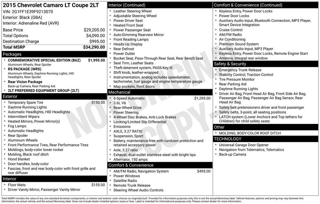 Black 2015 Chevrolet Camaro 2LT 2LT RWD 6-Speed Automatic with TapShift 3.6L V6 DGI DOHC VVT 2 Front Cup Holders, 3-Spoke Leather-Wrapped Steering Wheel, 4-Wheel Antilock 4-Wheel Disc Brakes, Adrenaline Red Interior Trim, Analog Instrumentation, Auxiliary Multi-Function Gauges, Body-Color Roof Ditch Molding, Boston Acoustics Premium 9-Speaker Audio System, Carpeted Front Floor Mats, Color Display Driver Information Center, Commemorative Special Edition, Electric Rear-Window Defogger, Electronic Cruise Control, Head-Up Display, Heated Driver & Front Passenger Seats, High-Intensity Discharge Headlamps, LATCH System, Leather-Wrapped Shift Knob, Maintenance-Free Battery, Manual Rake & Telescopic Steering Column, OnStar 6 Months Directions & Connections Plan, Power Programmable Door Locks, Preferred Equipment Group 2LT, Remote Keyless Entry, RS Package, Separate Daytime Running Lamps, SiriusXM Satellite Radio, StabiliTrak, Stainless-Steel Dual-Outlet Exhaust, Steering Wheel Mounted Audio Controls, Tire Sealant & Inflator Kit, Unique Rear Spoiler, Universal Home Remote, USB Port Audio System Feature, Wheels: 20 x 8 Front & 20 x 9 Rear Aluminum.