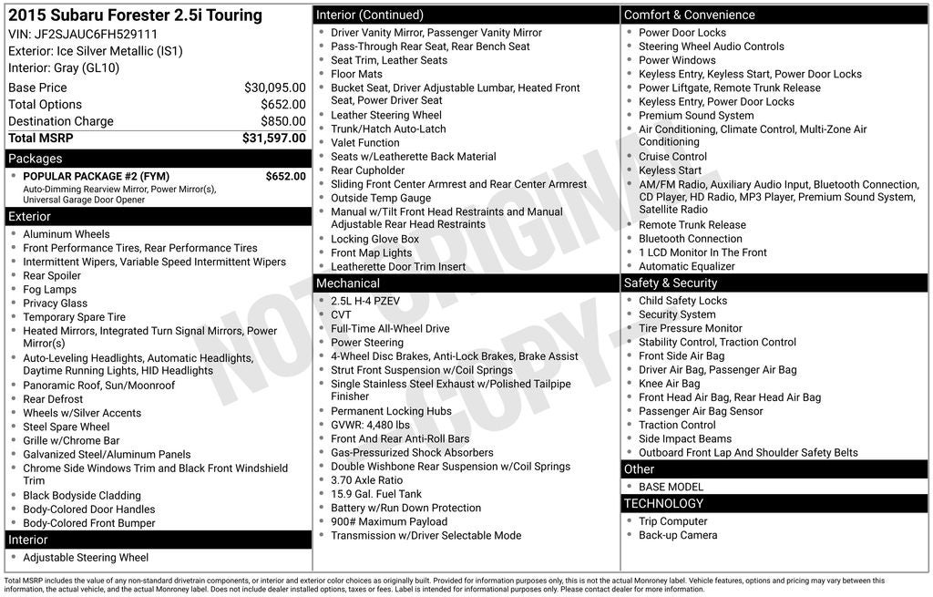 C** ONE OWNER ** MOONROOF ** 2015 Subaru Forester Ice Silver Metallic 2.5i Touring AWD Lineartronic CVT 2.5L 4-Cylinder DOHC 16V VVT Air Conditioning, Alloy wheels, Auto-Dimming Mirror w/Compass & HomeLink, Driver's Side Mirror, Exterior Mirror Hardware Kit, Exterior Parking Camera Rear, Front dual zone A/C, Front fog lights, harman/kardon 440W Amp & Speaker System, harman/kardonA Speakers, Heated Front Bucket Seats, Int. & Ext. Auto Dim Mirror w/Approach Lighting, Outside temperature display, Passenger's Side Mirror, Perforated Leather-Trimmed Upholstery, Popular Package #2, Power driver seat, Power moonroof, Premium audio system: harman/kardon, Radio: AM/FM Stereo w/HD & Single CD Player, Rear Bumper Cover, Remote keyless entry, Seat Back Cargo Net, Speed control, Turn signal indicator mirrors.Recent Arrival! Odometer is 18974 miles below market average! 24/32 City/Highway MPGAwards: * 2015 IIHS Top Safety Pick+ * 2015 KBB.com 10 Best Used Compact SUVs Under $15,000 * 2015 KBB.com 10 Best SUVs Under $25,000 * 2015 KBB.com 10 Best All-Wheel Drive Vehicles Under $25,000 * 2015 KBB.com 5-Year Cost to Own Awards * 2015 KBB.com Best Resale Value Awards * 2015 KBB.com Brand Image AwardsYou will love our NO HAGGLE, NO HASSLE PRICING here at Fitzgerald Auto Mall. Ask us about our BUYER PROTECTION PLAN, LOANER CAR PROGRAMS, AND FREE Vehicle History Report ** COMES WITH A WRITTEN FITZWAY CHECKOUT COVERING ALL MAJOR ITEMS! ALL FITZGERALD PRICES ARE REAL PRICES WITH NO SNEAKY PRICE CONDITIONS OR ADDITIONAL RECONDITIONING OR CERTIFICATION CHARGES! No Added Market Adjustments or Hidden Fees! Transparency You Can Trust, That's The FitzWay! Transparency You Can Trust.Reviews: * For those who require all-wheel drive for slick, low-traction environments, the 2015 Subaru Forester is almost the default choice in the compact-SUV segment. It's also a good choice for those seeking an extra measure of safety, reliability and resale value in their 5-passenger SUV. Source: KBB.com * Roomy interior; admirable fuel economy; availability of a stout turbocharged engine; standard all-wheel drive; great safety scores and available advanced safety features. Source: Edmunds