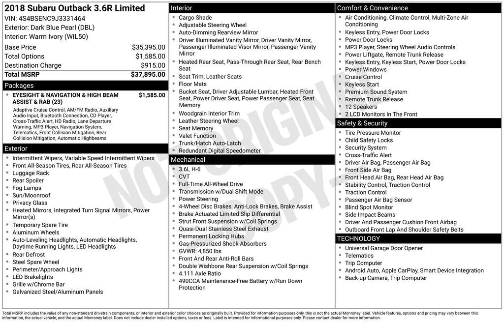 **Blue Pearl w Beige Leather**Sunroof**Navigation**Great Carfax**New Tires**Eye Sight PackaGE** 2018 Subaru Outback 3.6R Limited AWD CVT Lineartronic 3.6L Boxer H6 DOHC 24V Air Conditioning, Apple CarPlay/Android Auto, Exterior Parking Camera Rear, EyeSight & Navigation & High Beam Assist & RAB, Front Bucket Seats, Front dual zone A/C, harman/kardon Surround Sound Speaker System, Heated Reclining Front Bucket Seats, High Beam Assist (HBA), Memory seat, Navigation System, Perforated Leather-Trimmed Upholstery, Power driver seat, Power Liftgate, Power moonroof, Power passenger seat, Radio: Subaru STARLINK 8.0 Multimedia Nav System, Remote keyless entry, Reverse Automatic Braking (RAB), Smartphone Integration, Speed control, Turn signal indicator mirrors, Vehicle Information Display, Wheels: 18 x 7.0 Aluminum Alloy w/Machine Finish.