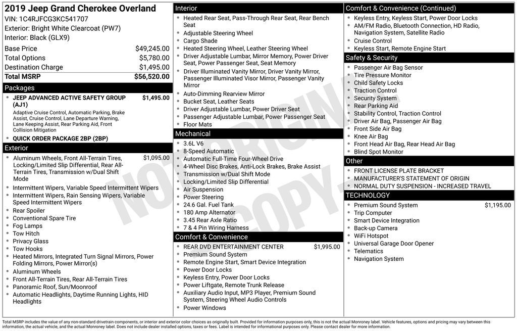 Bright White Clearcoat 2019 Jeep Grand Cherokee Overland 4WD 8-Speed Automatic 3.6L V6 24V VVT 4WD, 230MM Rear Axle, Adaptive Cruise Control w/Stop, Advanced Brake Assist, Electronic Limited Slip Differential Rear Axle, Fuel Tank Skid Plate Shield, Full Speed FWD Collision Warn Plus, Jeep Advanced Active Safety Group, Lane Departure Warning Plus, Normal Duty Suspension - Increased Travel, Off-Road Adventure II, Parallel & Perp Park Assist w/Stop, Quadra-Drive II 4WD System, Quick Order Package 2BP, Rain Sensitive Windshield Wipers, Selec-Speed Control, Steering Wheel Mounted Shift Control, Trail Rated Badge, Wheels: 18 x 8.0 Tech Gray Aluminum.