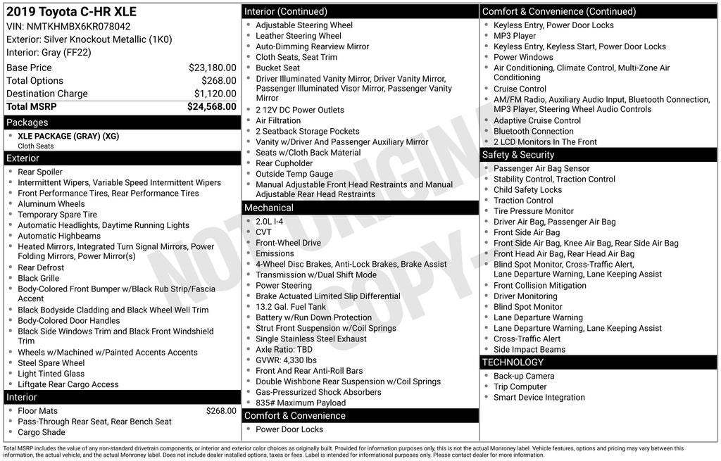Discover the perfect blend of style, technology, and performance in this exceptional 2019 Toyota C-HR XLE. With its sleek gray exterior, this C-HR is sure to turn heads wherever it goes.