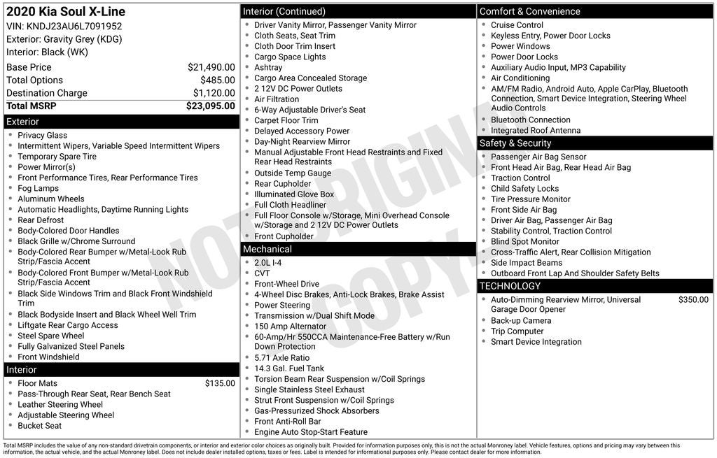 ** ONE OWNER ** Gravity Gray 2020 Kia Soul X-Line FWD CVT 2.0L I4 MPI DOHC 16V LEV3-SULEV30 147hp 6-Way Adjustable Driver's Seat, Apple CarPlay & Android Auto, Exterior Parking Camera Rear, Front Bucket Seats, Fully automatic headlights, Radio: AM/FM/MP3 Audio System, Remote keyless entry, Split folding rear seat, Steering wheel mounted audio controls, Wheels: 18 x 7.5 Alloy, Woven Cloth Seat Trim. COMES WITH A WRITTEN FITZWAY CHECKOUT COVERING ALL MAJOR ITEMS! THE BEST GUARANTEE IN THE ENTIRE COUNTRY! DON'T PAY FOR A MISTAKE SOMEWHERE ELSE! No Added Market Adjustments or Hidden Fees! Transparency You Can Trust, That's The FitzWay! Please visit us at Fitzgerald Used Cars Clearwater between NE Coachman and Sunset Point RD on the north bound service rd. At 23499 US 19 N, Clearwater FL 33765. OR Contact a Sales Associate 727-799-1999. Recent Arrival! 27/33 City/Highway MPG