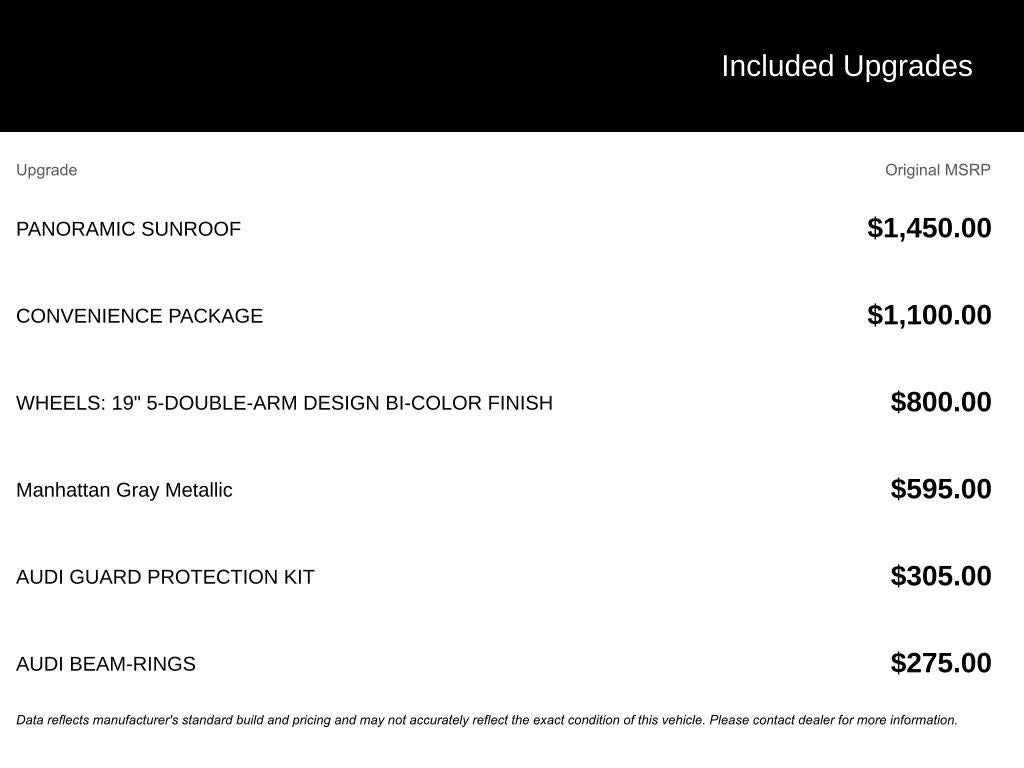 Step inside the cabin and be captivated by the premium craftsmanship and thoughtful amenities. The Leather Seating Surfaces, Heated 8-Way Power Front Bucket Seats, and Genuine Wood Inlays create an inviting and luxurious atmosphere. The Audi Sound System, SiriusXM All Access Service, and Convenience Package with features like Driver Seat Memory and Audi Advanced Key further enhance your driving enjoyment.