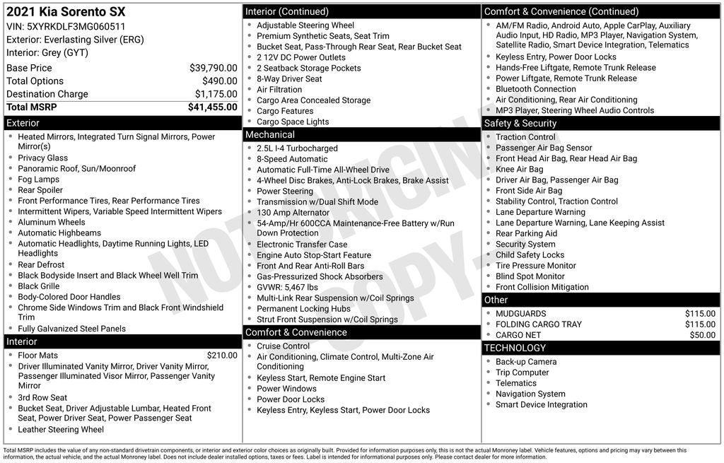 Everlasting Silver 2021 Kia Sorento SX AWD 8-Speed DCT 2.5L I4 DGI Turbocharged DOHC 16V LEV3-ULEV70 281hp AWD, 3rd row seats: split-bench, 6 Speakers, Apple CarPlay & Android Auto, Emergency communication system: UVO link, Exterior Parking Camera Rear, Front dual zone A/C, Heated Front Bucket Seats, Navigation System, Power driver seat, Power Liftgate, Power moonroof, Power passenger seat, Premium Leatherette Seat Trim, Radio: AM/FM Audio System w/Navigation, Rear air conditioning, Remote keyless entry, Smart Key w/ Push Button and Remote Start, Speed control, Wheels: 20 Gloss Black Alloy.