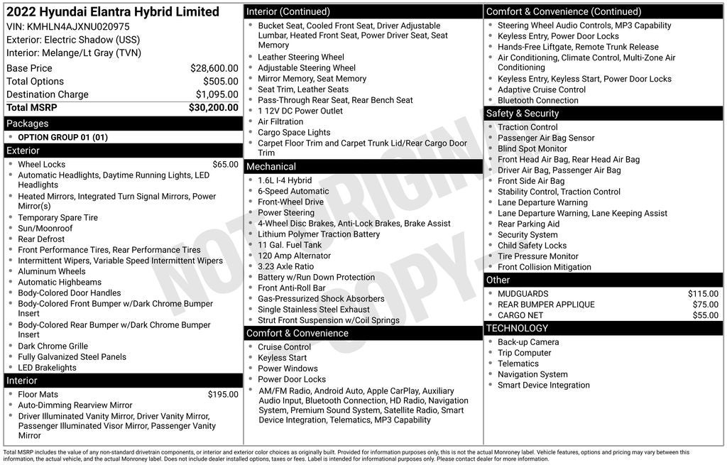 ** ONE OWNER ** Electric Shadow 2022 Hyundai Elantra Hybrid Limited FWD 6-Speed EcoShift Dual Clutch 1.6L I4 DGI Hybrid DOHC 16V 1.6L I4 DGI Hybrid DOHC 16V, 17 x 7.0J Alloy Wheels, Apple CarPlay & Android Auto, Delay-off headlights, Exterior Parking Camera Rear, Front Bucket Seats, Front dual zone A/C, Heated & Ventilated Front Bucket Seats, Leather-Trimmed Seating Surfaces, Low tire pressure warning, Memory seat, Navigation System, Outside temperature display, Power driver seat, Power moonroof, Radio: AM/FM/HD/SiriusXM Display Audio, Remote keyless entry, Speed control, Turn signal indicator mirrors, Ventilated front seats. COMES WITH A WRITTEN FITZWAY CHECKOUT COVERING ALL MAJOR ITEMS! THE BEST GUARANTEE IN THE ENTIRE COUNTRY! DON'T PAY FOR A MISTAKE SOMEWHERE ELSE! No Added Market Adjustments or Hidden Fees! Transparency You Can Trust, That's The FitzWay! Please visit us at Fitzgerald Used Cars Clearwater between NE Coachman and Sunset Point RD on the north bound service rd. At 23499 US 19 N, Clearwater FL 33765. OR Contact a Sales Associate 727-799-1999. Recent Arrival!