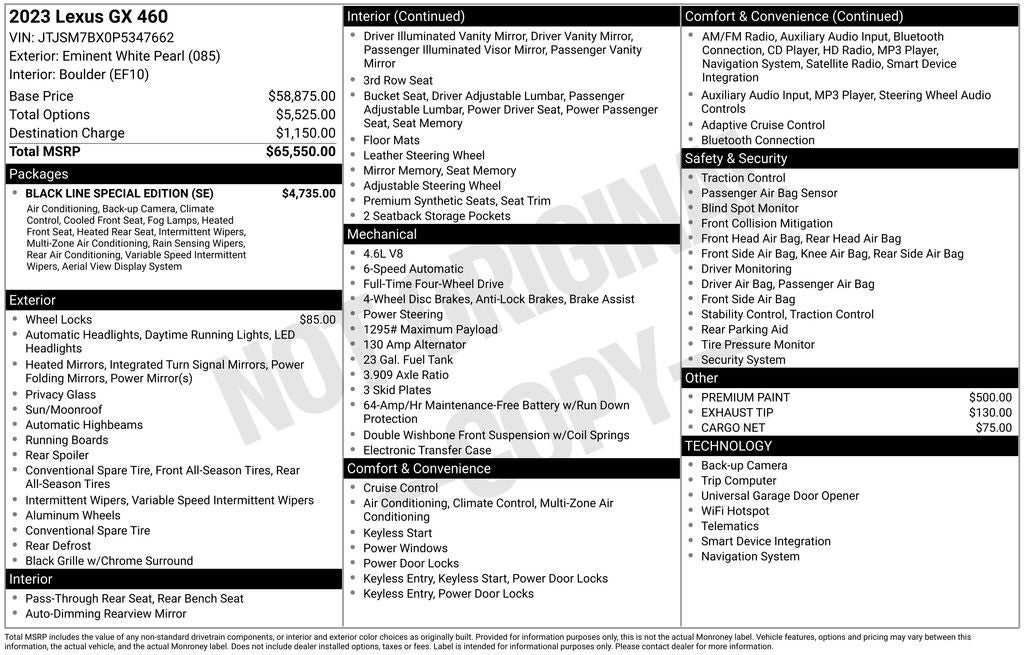 **BLACK LINE EDITION**CLEAN CARFAX**FLORIDA SUV** FACTORY WARRANTY STILL APPLIES ** Eminent White Pearl 2023 Lexus GX 460 4WD 6-Speed Automatic with Sequential Shift ECT 4.6L V8 DOHC Dual VVT-i 32V 18 x 7.5J Aluminum Alloy Wheels, 3rd row seats: split-bench, Apple CarPlay/Android Auto, Black Line Special Edition, Delay-off headlights, Driver's Seat Mounted Armrest, Dual Front & Rear Auto Air Conditioner, Emergency communication system: Safety Connect (3-year trial), Exterior Parking Camera Rear, Front & Rear Heated Seats, LED Front Fog & Driving Lamp, Memory seat, Navigation system: Lexus Enform Dynamic Navigation, NuLuxe Seat Trim (EF), Outside Rearview Mirrors w/Camera, Panoramic View & Multi-Terrain Monitor, Power driver seat, Power moonroof, Power passenger seat, Radio: Lexus Multimedia System w/Navigation, Speed control, Steering wheel mounted audio controls, Ventilated Front Seats, Windshield De-Icer, Windshield Wiper Control w/Rain Sensor.