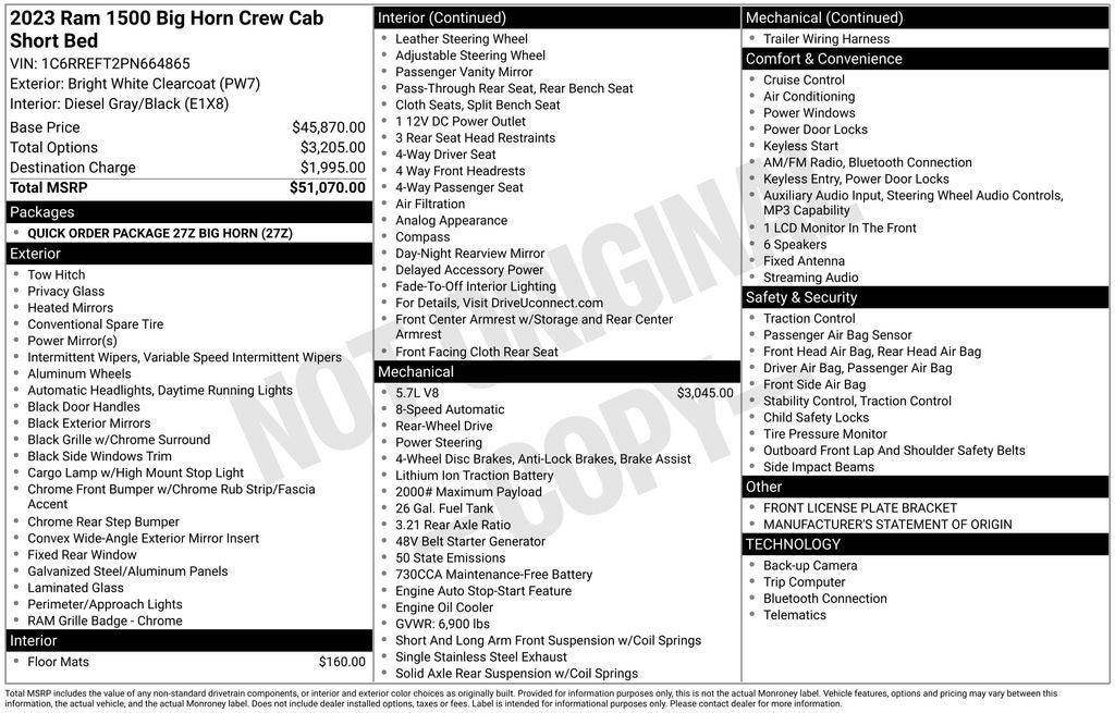 Bright White Clearcoat 2023 Ram 1500 Big Horn/Lone Star RWD 8-Speed Automatic HEMI 5.7L V8 Multi Displacement VVT eTorque 6 Speakers, Big Horn Badge, Cloth Bench Seat, Emergency communication system: SiriusXM Guardian, Exterior Parking Camera Rear, Fully automatic headlights, GPS Antenna Input, Integrated Voice Command w/Bluetooth®, Low tire pressure warning, Overhead console, Power door mirrors, Power windows, Quick Order Package 27Z Big Horn, Radio data system, Rear seat center armrest, Rear step bumper, Remote keyless entry, Speed control, Steering wheel mounted audio controls, Wheels: 18 x 8 Cast-Aluminum Painted.